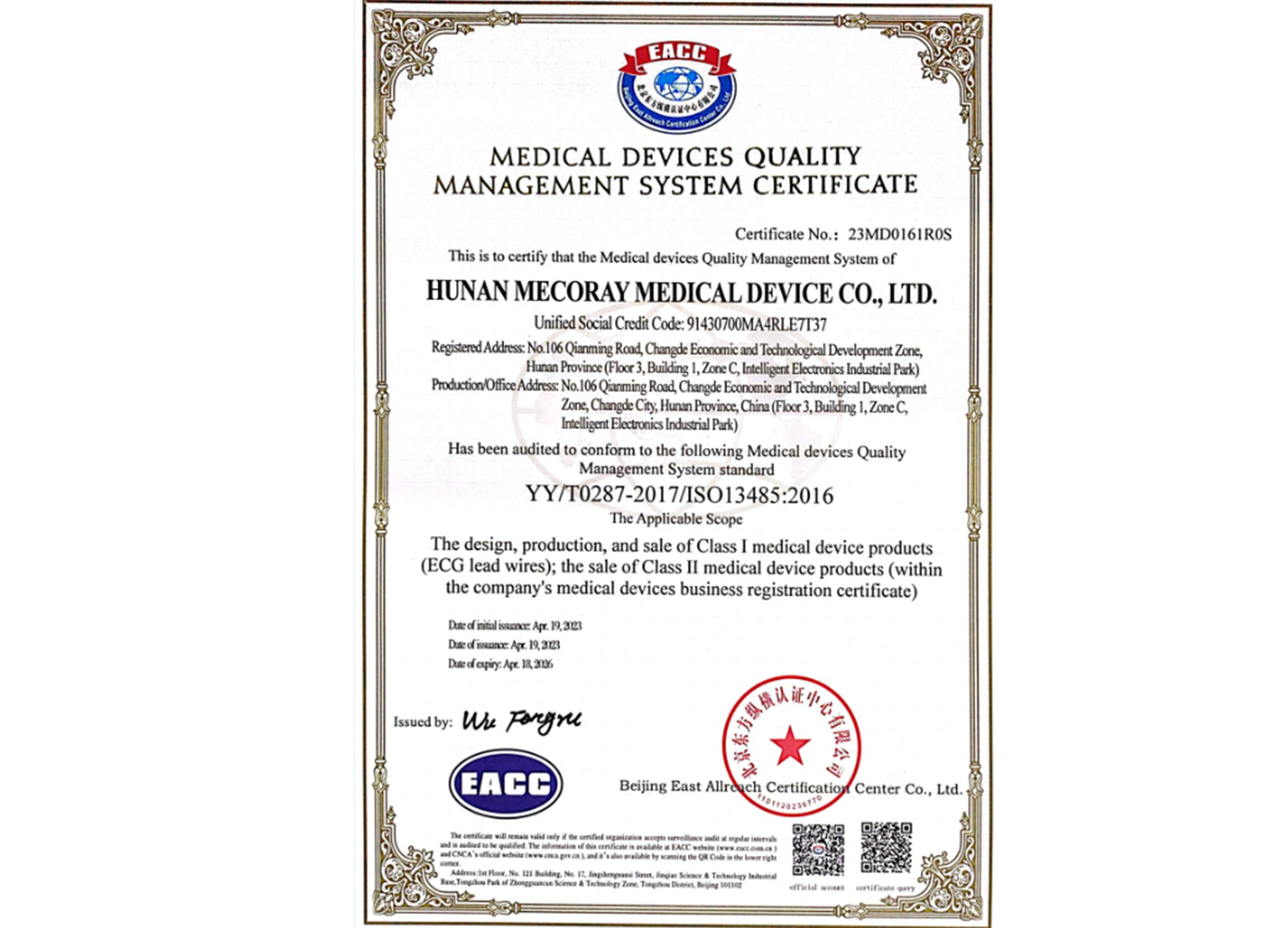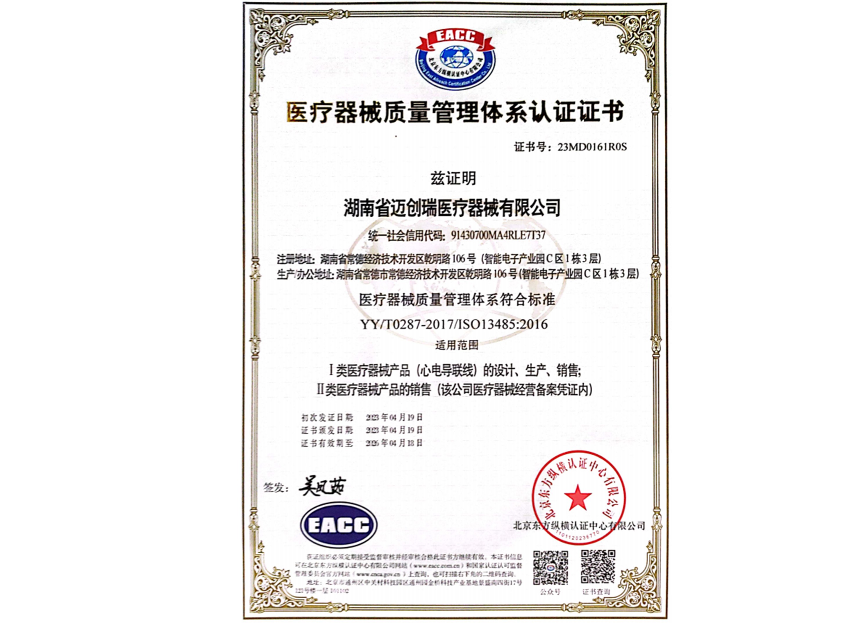 醫(yī)療器械質(zhì)量管理體系認(rèn)證證書