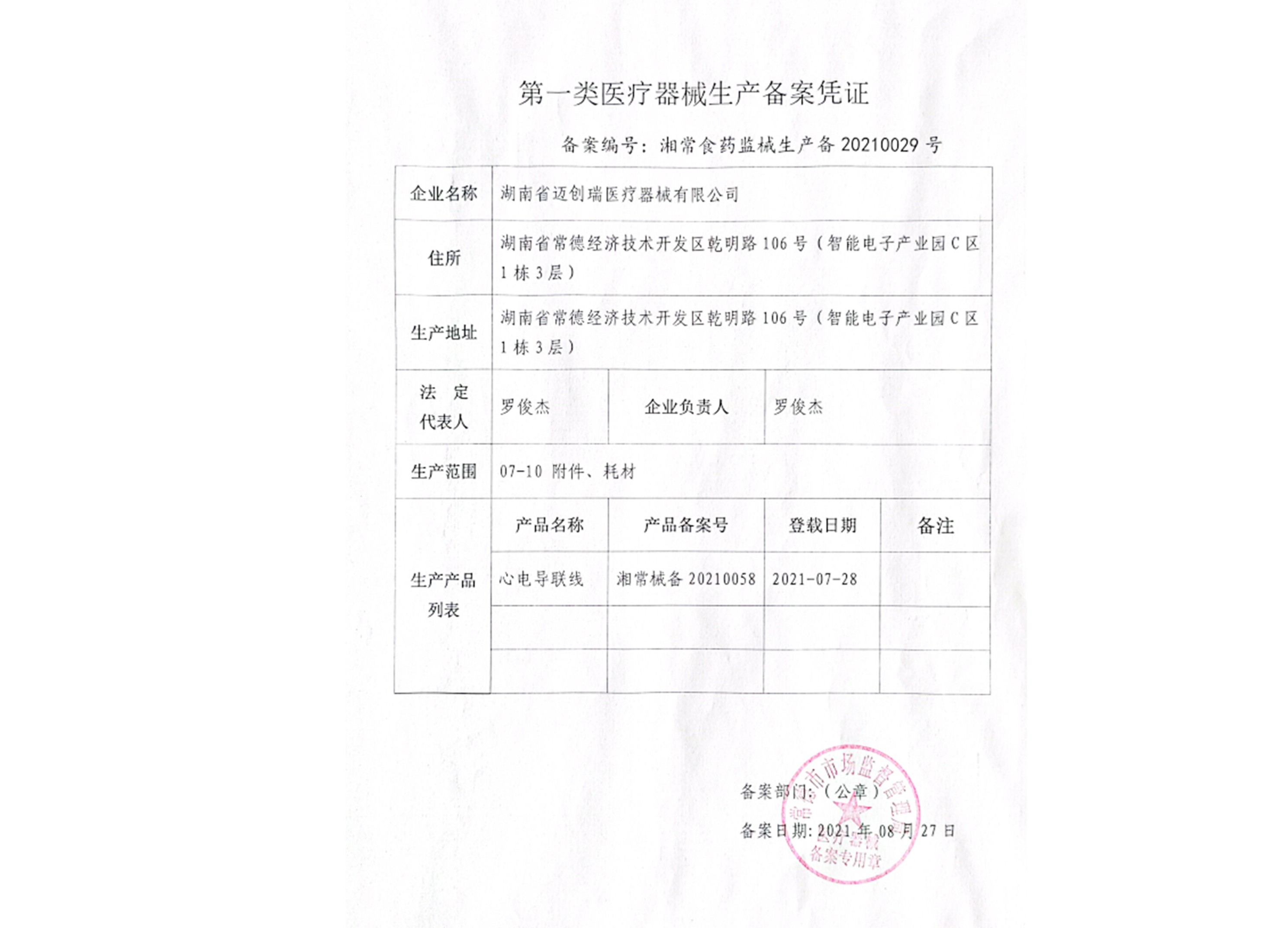 第一類醫(yī)療器械生產(chǎn)備案憑證